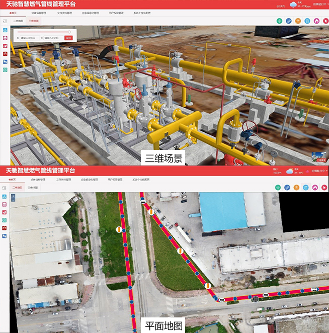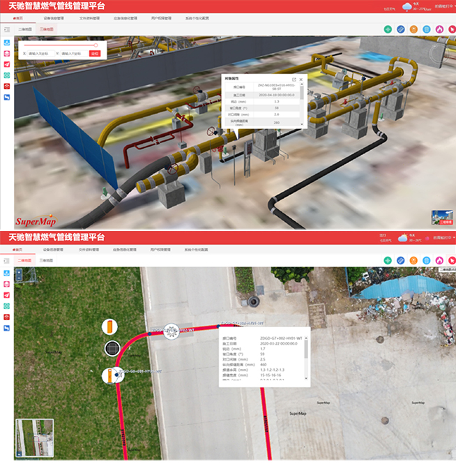 平台拥有完善的二三维数据处理流程,能快速高效的处理并生成燃气管线二三维成果数据,二三维数据模式为业主单位提供多方式、多角度的方式帮助业主单位了解区域内现状,实现了从数据结构、数据存储、数据管理、可视化和分析功能等多层次整合,形成了完整二维与三维一体化,通过二维数据和三维模型的组合,还可实现二维功能和三维效果的完美搭配应用,满足直观、精确、形象的管网现状表达。